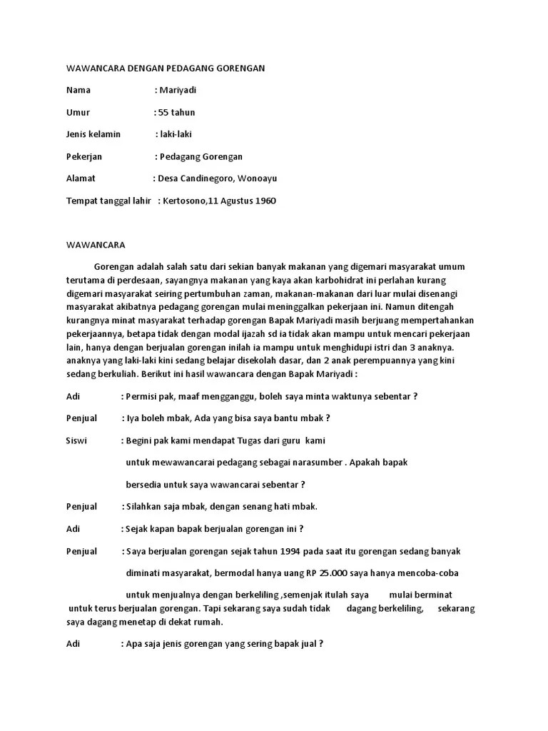 Contoh laporan hasil wawancara dalam bentuk makalah 9n0o1mg55knv. Contoh wawancara dengan pedagang bakso. Siang, iya silahkan saja mbak! 5 contoh wawancara singkat dengan narasumber pedagang dll. Analisis strategi pemasaran usaha kecil pengrajin tempe. Pdf) profil usaha pembuatan tempe cv cipta panca persada kleak … Contoh teks wawancara dengan pedagang buah halo sahabat bloggedewek semua kalian sedang diberi tugas membuat suatu teks wawancara dengan pengusaha atau pedagang buah. Strategi bauran pemasaran marketing mixpada home industri. Contoh wawancara dengan pedagang pertama. Contoh pertanyaan wawancara dengan pedagang warung bahasa sunda. Selamat siang bapak, saya dari surat kabar harian jakarta, bisa minta waktunya untuk wawancara sebentar? Interview) merupakan pembicaraan antara dua orang atau lebih yang terjadi antara narasumber dan pewawancara. Contoh laporan hasil wawancara dengan pedagang kumpulan contoh laporan.